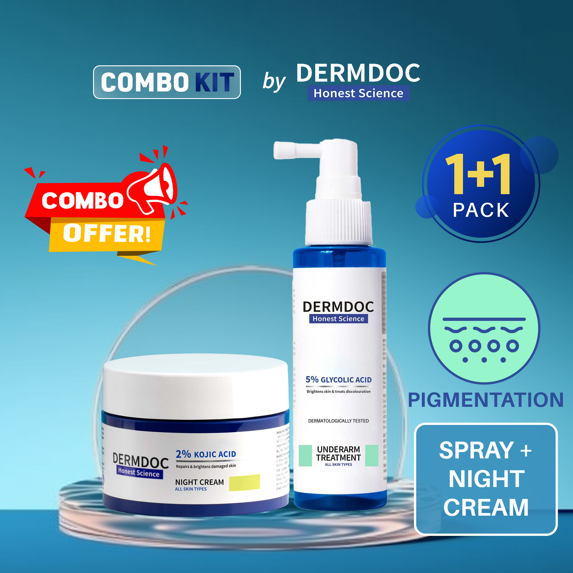 DERMDOC Combo Kit Brighten Up Combo | kojic acid night cream | glycolic acid underarm spray | treatment for dark underarms, dark patches | hyperpigmentation | dark spots | skin brightening cream