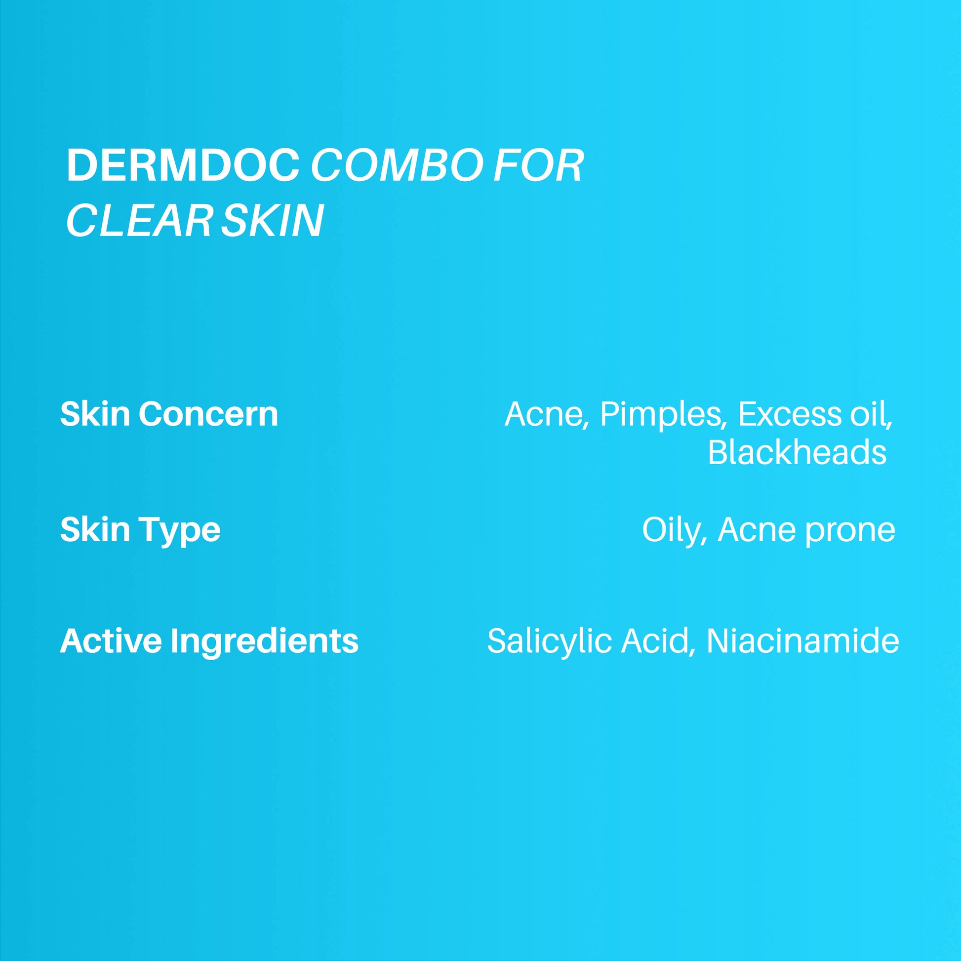 Blackheads and acne are a pain to deal with. But here is a combo that helps you get clear, glowing skin without any hassle. DERMDOC Combo for Clear Skin is loaded with two effective and dermatologically tested actives, Salicylic Acid & Niacinamide, that help restrict excess oil production while keeping acne at bay.